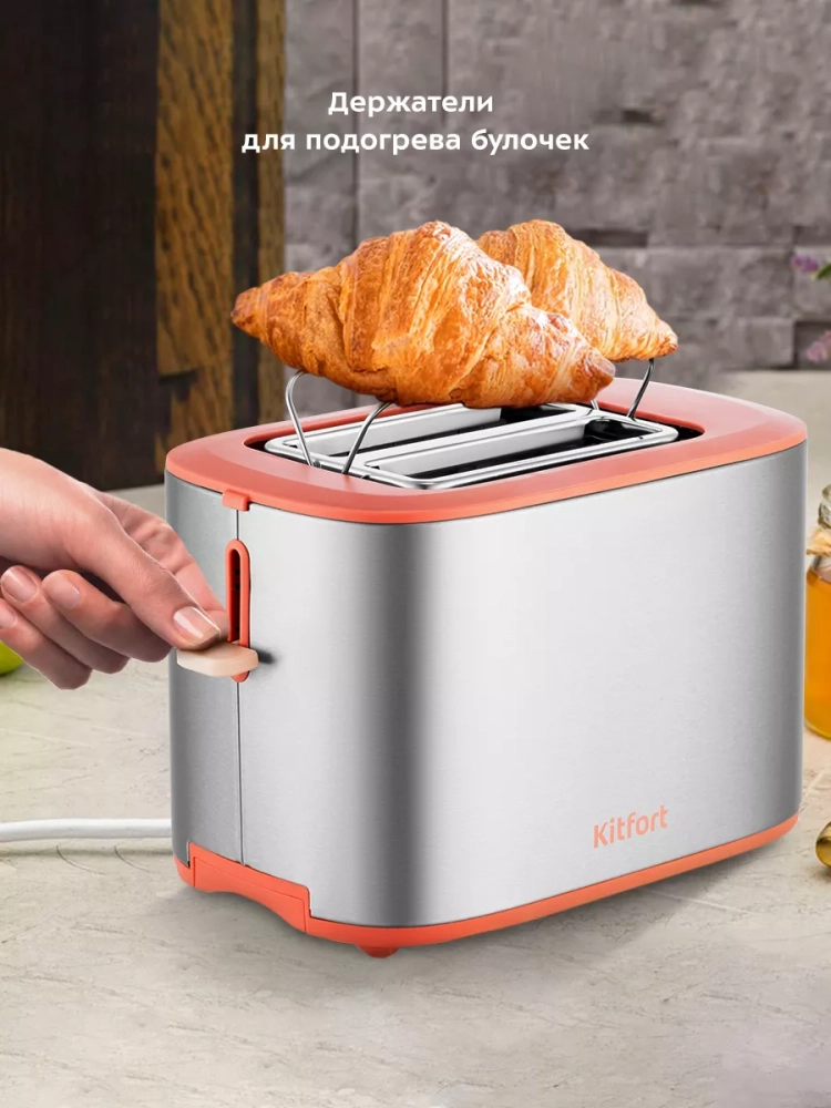 Загруженные тосты автоматически центрируются, чтобы их обжарка с двух сторон была равномерной независимо от толщины куска. Благодаря широким слотам можно поджаривать толстые куски хлеба, а не только тонкие. По окончании приготовления тостер автоматически отключается, а тосты поднимаются вверх, чтобы их было удобнее извлечь. Механизм экстра-подъема позволяет приподнять тосты выше для удобного извлечения тостов небольшого размера. Вы можете приготовить 1 или 2 тоста одновременно. Тостер имеет специальные держатели, на которые мы можете положить булочки, круассаны и другую выпечку, чтобы подогреть их.