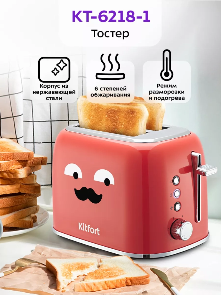 Электрический тостер Kitfort КТ-6218 создан для тех, кто любит полакомиться ароматным и хрустящим горячим поджаренным хлебом. Особый вкус и цвет корочки тостов получаются такими благодаря карамелизации сахара, содержащегося в муке, при инфракрасном нагреве в процессе приготовления.