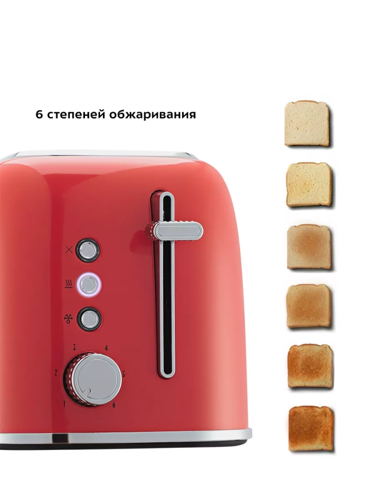 Тостер оснащен регулятором степени обжаривания и тремя кнопками со световыми индикаторами. Режим подогрева служит для подогрева уже готовых тостов, если они остыли. Режим разморозки позволяет приготовить тосты из замороженного хлеба. Загруженные тосты автоматически центрируются, чтобы их обжаривание с двух сторон было равномерной независимо от толщины куска. По окончании приготовления тостер автоматически отключается, а тосты поднимаются вверх, чтобы их было удобнее извлечь. Механизм экстра-подъема позволяет приподнять выше тосты небольшого размера для их удобного извлечения. Вы можете приготовить 1 или 2 тоста одновременно.