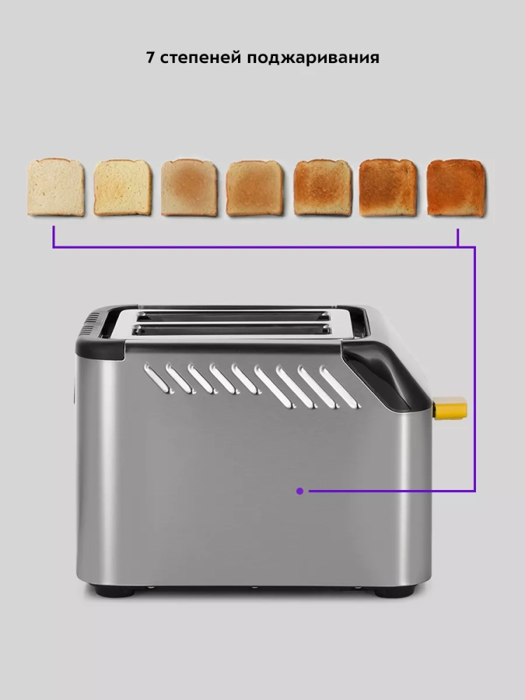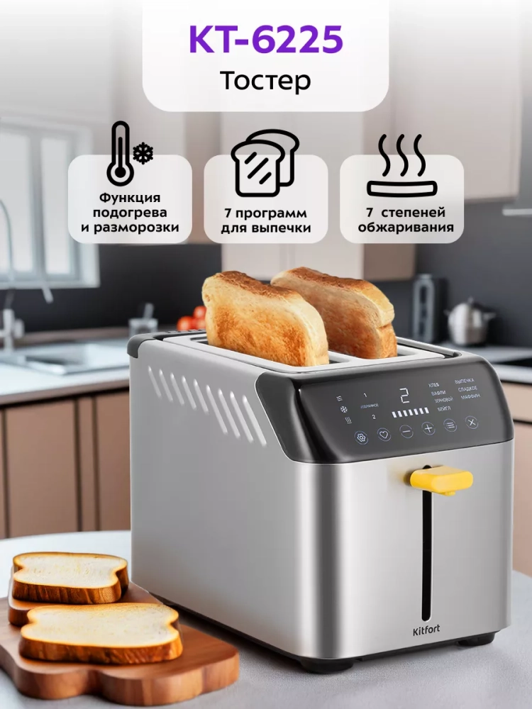 Электрический тостер Kitfort KT-6225 создан для тех, кто любит полакомиться ароматным и хрустящим горячим поджаренным хлебом. Особый вкус и цвет корочки тостов получаются такими благодаря карамелизации сахара, содержащегося в муке, при инфракрасном нагреве в процессе приготовления. Тостер оснащен цифровым дисплеем с сенсорными кнопками. Режим подогрева служит для подогрева уже готовых тостов, если они остыли. Режим разморозки позволяет приготовить тосты из замороженного хлеба. Также тостер оснащен семью программами для обжаривания разных мучных изделий: «Хлеб», «Вафли», «Зерновой», «Бейгл», «Выпечка», «Сладкое» и «Маффин». Программы отличаются временем приготовления, так как разную выпечку необходимо поджаривать разное время, чтобы получить желаемую степень обжарки. Программа «Бейгл» позволяет обжарить выпечку только с одной стороны. Выбранный режим, программу и степень обжаривания можно сохранить, чтобы не настраивать снова при следующем использовании. Загруженные тосты автоматически центрируются, чтобы их обжарка с двух сторон была равномерной независимо от толщины куска. По окончании приготовления тостер автоматически отключается, а тосты поднимаются вверх, чтобы их было удобнее извлечь. Вы можете приготовить 1 или 2 тоста одновременно. Снизу расположен съемный поддон для крошек, поэтому чистить тостер просто и удобно. Тостер предназначен для приготовления тостов в домашних условиях и может применяться в квартирах, загородных домах, клиентами в гостиничных номерах, бытовых помещениях магазинов, офисов и т.п. для некоммерческой эксплуатации.