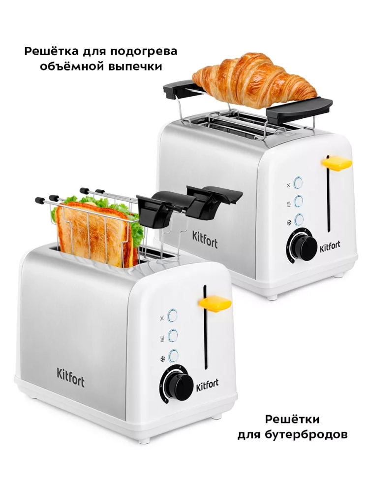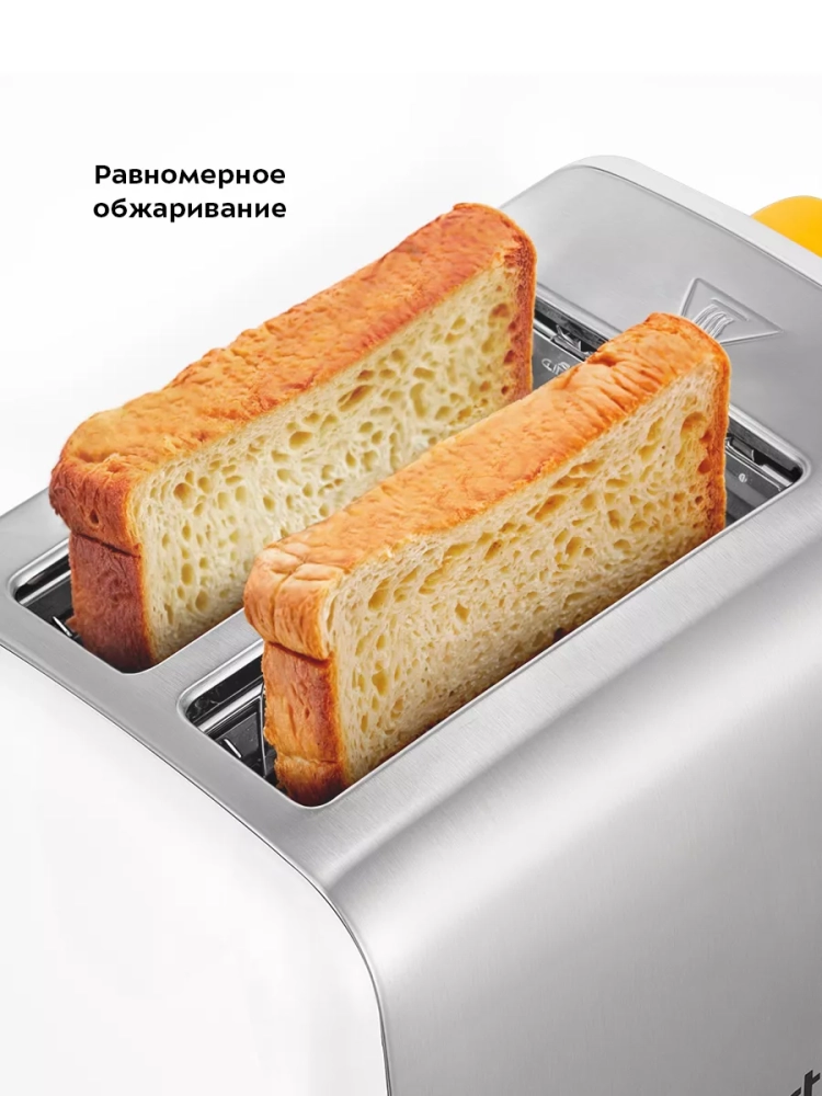 Тостер оснащен регулятором степени обжаривания и тремя кнопками со световыми индикаторами. Режим подогрева служит для подогрева уже готовых тостов, если они остыли. Режим разморозки позволяет приготовить тосты из замороженного хлеба. Загруженные тосты автоматически центрируются, чтобы их обжаривание с двух сторон было равномерным независимо от толщины куска. По окончании приготовления тостер автоматически отключается, а тосты поднимаются вверх, чтобы их было удобнее извлечь. Механизм экстра-подъема позволяет приподнять выше тосты небольшого размера для их удобного извлечения. Вы можете приготовить 1 или 2 тоста одновременно.