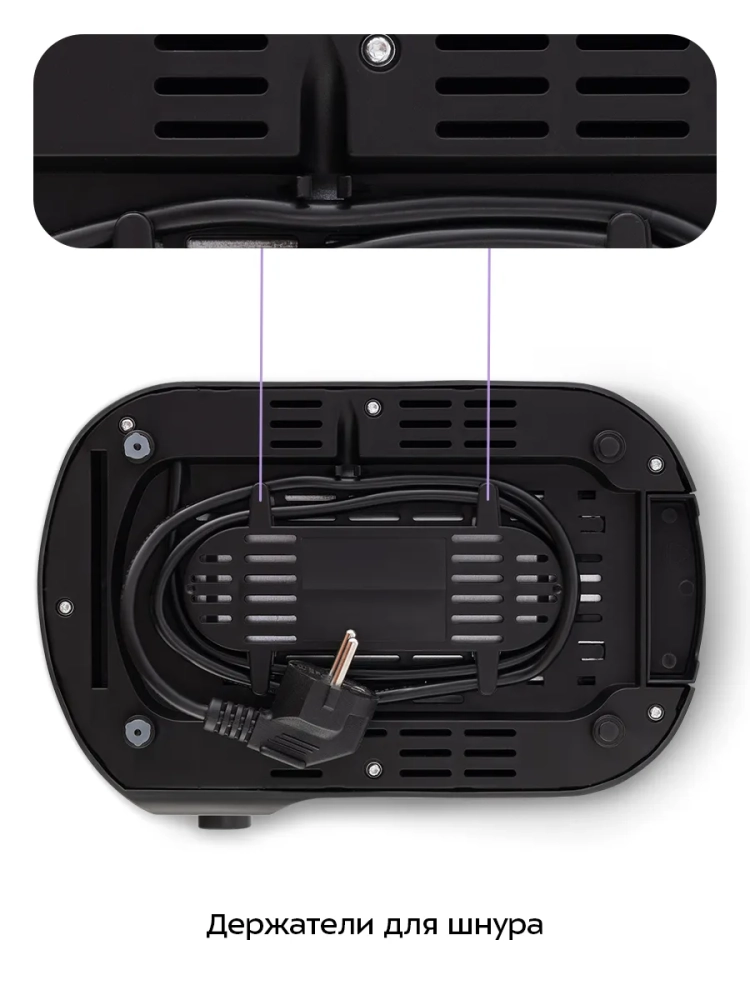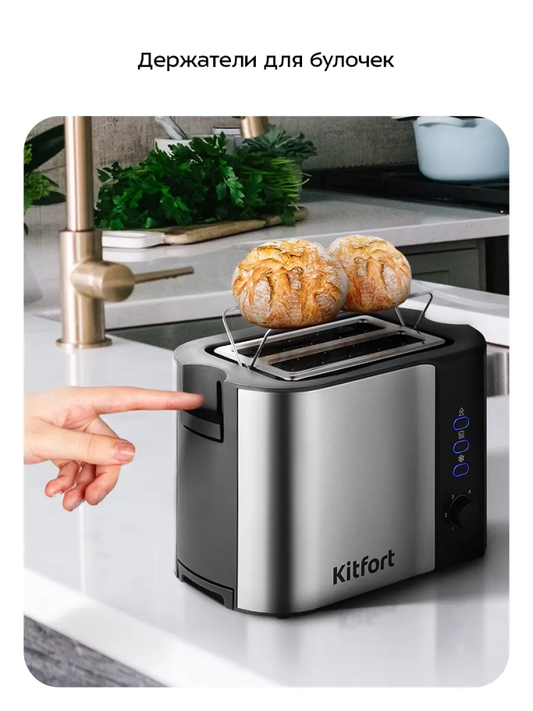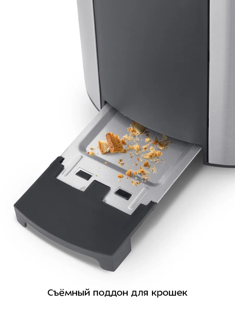 У тостера есть специальные держатели, на которые можно положить булочки или другую выпечку, чтобы подогреть. Съемный поддон для крошек позволяет легко и удобно очистить тостер от хлебных крошек.