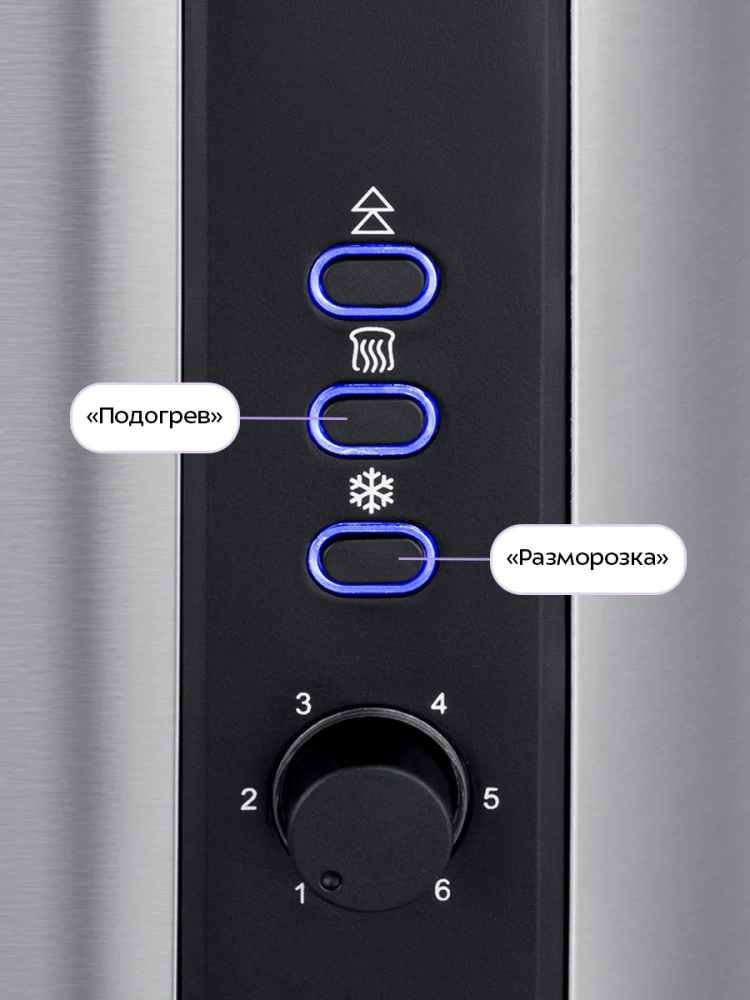 Тостер оснащен регулятором степени обжаривания и тремя кнопками со световыми индикаторами. Режим подогрева служит для подогрева уже готовых тостов, если они остыли. Режим разморозки позволяет приготовить тосты из замороженного хлеба. Загруженные тосты автоматически центрируются, чтобы их обжаривание с двух сторон было равномерным независимо от толщины куска. По окончании приготовления тостер автоматически отключается, а тосты поднимаются вверх, чтобы их было удобнее извлечь. Вы можете приготовить 1 или 2 тоста одновременно.