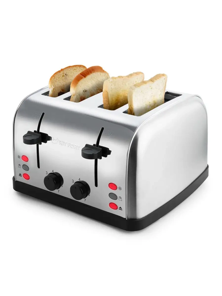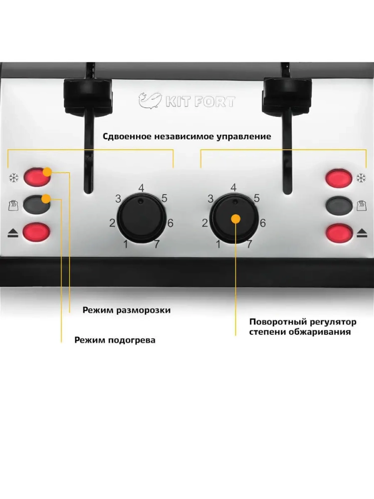 Тостер Китфорт КТ-2016 — сдвоенный: он состоит из двух секций с независимым управлением в едином корпусе и позволяет приготовить от одного до четырех тостов одновременно.