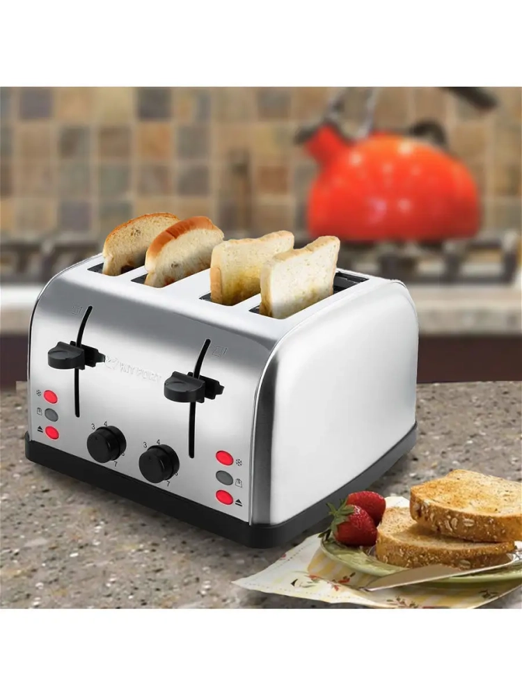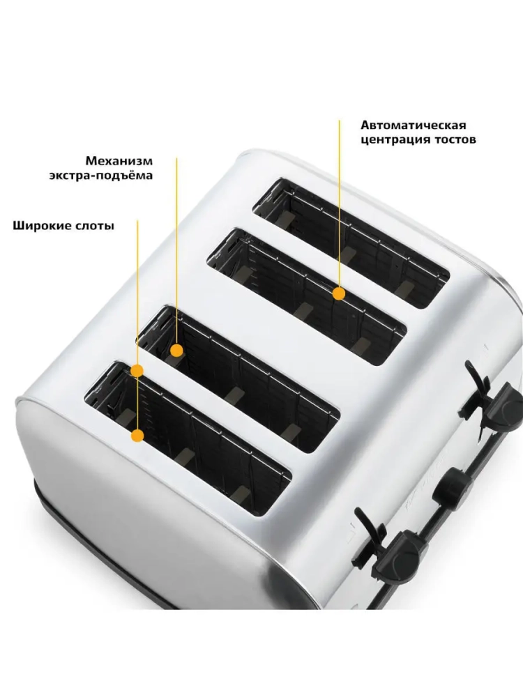 Каждая секция оснащена поворотным регулятором степени обжаривания и тремя кнопками со световыми индикаторами. Режим разогрева служит для разогрева уже готовых тостов, если они остыли. Режим разморозки позволяет приготовить тосты из замороженного хлеба. Благодаря широким слотам, можно поджаривать толстые куски хлеба, а не только тонкие. Загруженные тосты автоматически центрируются, чтобы их обжарка с двух сторон была равномерной независимо от толщины куска. По окончании приготовления тостер автоматически отключается, а тосты поднимаются вверх, чтобы их было удобнее извлечь. Механизм экстра-подъема позволяет приподнять тосты выше для удобного извлечения тостов небольшого размера.