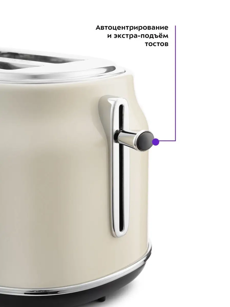 Тостер оснащен поворотным регулятором степени обжаривания и тремя кнопками со световыми индикаторами. Режим разогрева служит для разогрева уже готовых тостов, если они остыли. Режим разморозки позволяет приготовить тосты из замороженного хлеба. Благодаря широким слотам можно поджаривать толстые куски хлеба, а не только тонкие. Загруженные тосты автоматически центрируются, чтобы их обжарка с двух сторон была равномерной независимо от толщины куска. По окончании приготовления тостер автоматически отключается, а тосты поднимаются вверх, чтобы их было удобнее извлечь. Механизм экстра-подъема позволяет приподнять тосты выше для удобного извлечения тостов небольшого размера. Вы можете приготовить 1 или 2 тоста одновременно.