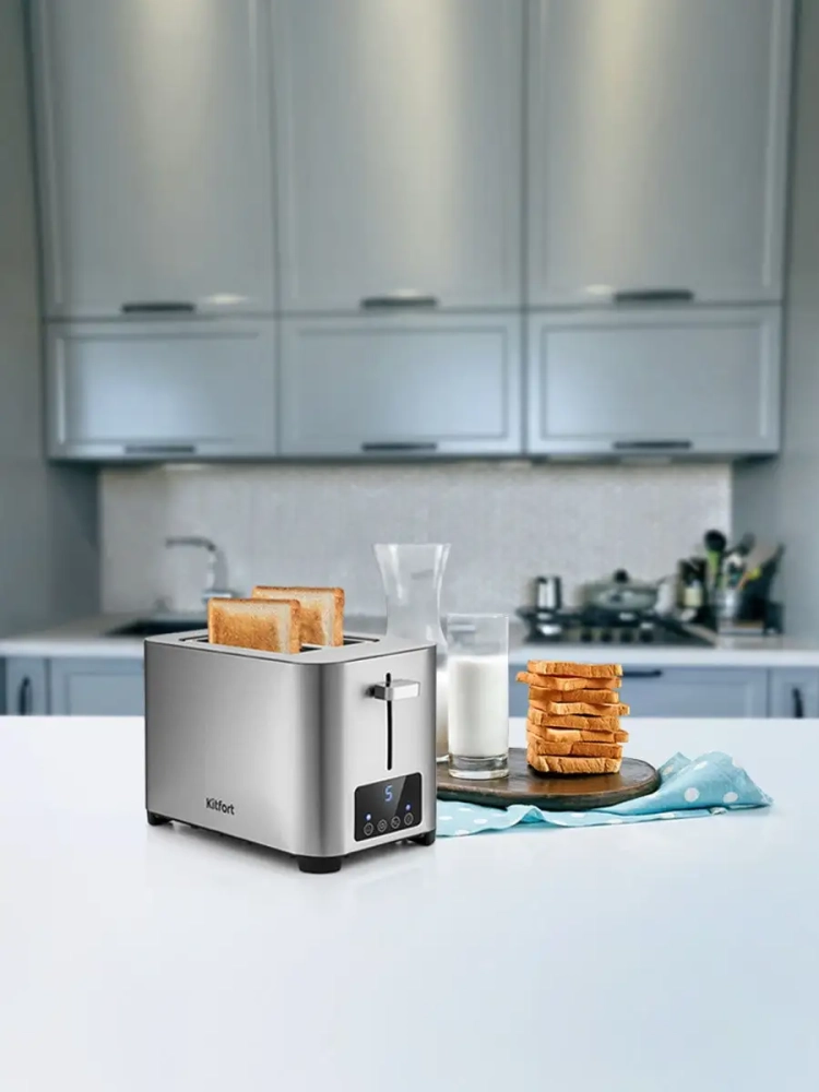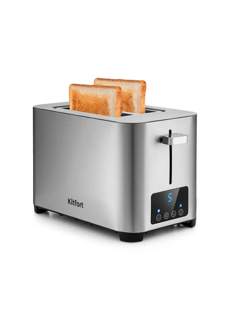Тостер Китфорт оснащен панелью управления с LED-дисплеем и сенсорными кнопками, с помощью которых регулируется степень поджаривания, а также включаются режимы «Подогрев» или «Разморозка». Режим «Подогрев» служит для разогрева уже готовых тостов, если они остыли, а режим «Разморозка» позволяет приготовить тосты даже из замороженного хлеба. Благодаря семи степеням поджаривания вы можете приготовить горячие тосты на любой вкус и из любых видов хлеба.