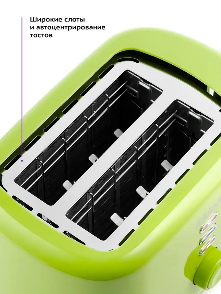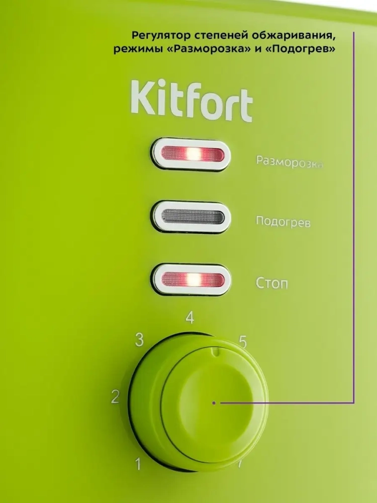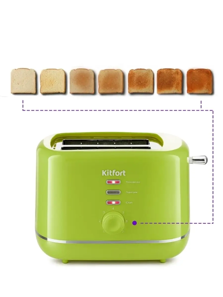 Тостер Китфорт оснащен поворотным регулятором степени обжаривания и тремя кнопками со световыми индикаторами. Режим подогрева служит для подогрева уже готовых тостов, если они остыли. Режим разморозки позволяет приготовить тосты из замороженного хлеба. Благодаря широким слотам можно поджаривать толстые куски хлеба, а не только тонкие. Загруженные тосты автоматически центрируются, чтобы их обжарка с двух сторон была равномерной независимо от толщины куска. По окончании приготовления тостер автоматически отключается, а тосты поднимаются вверх, чтобы их было удобнее извлечь. Вы можете приготовить 1 или 2 тоста одновременно.