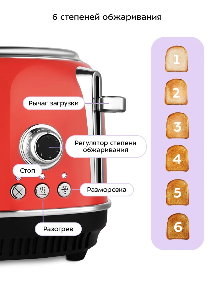 Тостер оснащен регулятором степени обжаривания и тремя кнопками со световыми индикаторами. Режим «Разогрев» служит для подогрева уже готовых тостов, если они остыли. Режим «Разморозка» позволяет приготовить тосты из замороженного хлеба. По окончании приготовления тостер автоматически отключается, а тосты поднимаются вверх, чтобы их было удобнее извлечь.
