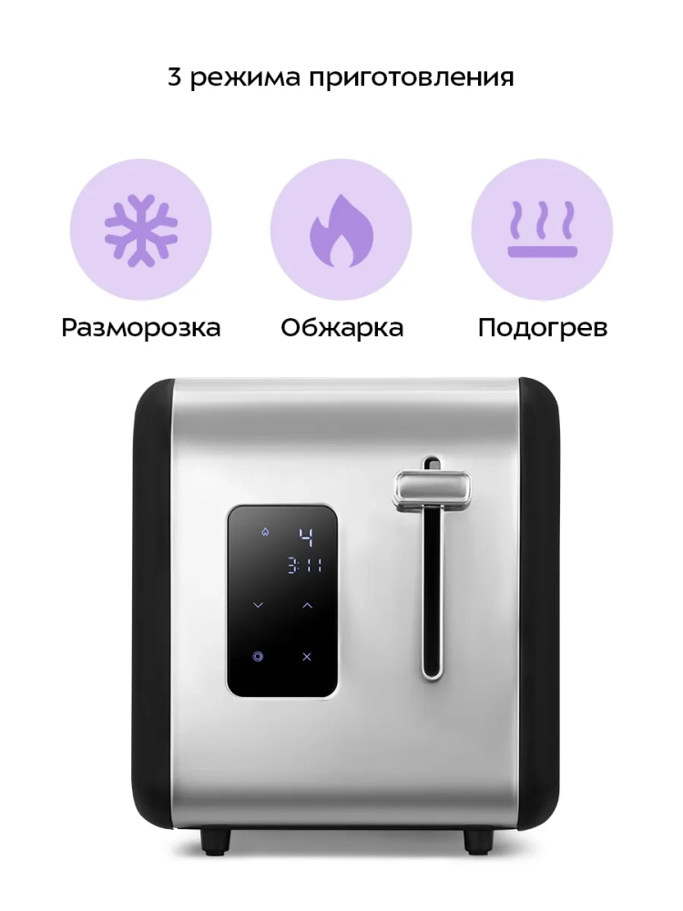 Тостер оснащен сенсорной панелью управления с четырьмя кнопками. Для получения тостов различной степени обжарки предусмотрено 6 режимов. Функция «Подогрев» поможет разогреть уже готовые, но остывшие тосты. Функция «Разморозка» предназначена для приготовления тостов из замороженного хлеба.