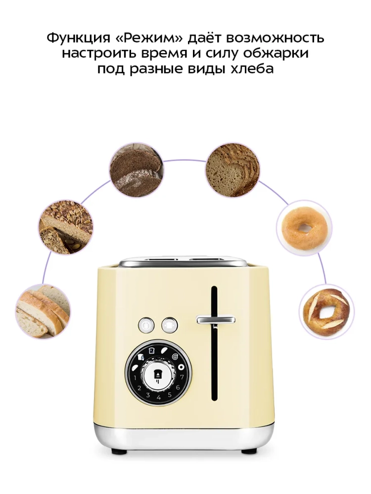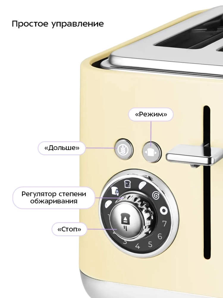 Тостер оснащен регулятором степени обжаривания и двумя кнопками. Функция «Дольше» увеличивает время обжаривания хлеба. По окончании приготовления тостер автоматически отключается, а тосты поднимаются вверх, чтобы их было удобнее извлечь.