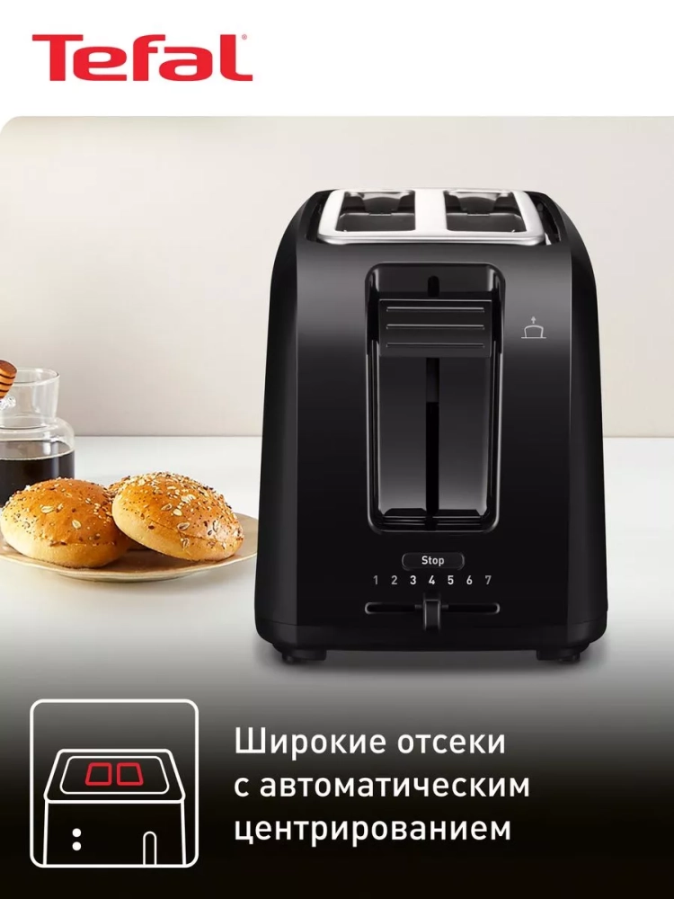 Тостер оснащен тремя дополнительными функциями: кнопка остановки позволяет в любой момент прервать процесс, кнопка размораживания помогает быстро подготовить замороженные ломтики к поджарке, а кнопка подогрева обеспечивает приятную температуру готовых тостов без их пересушивания. Тостер Vita от Tefal, выполненный в элегантном черном глянцевом дизайне, станет стильным и практичным элементом вашей кухни, придавая ей современный вид.