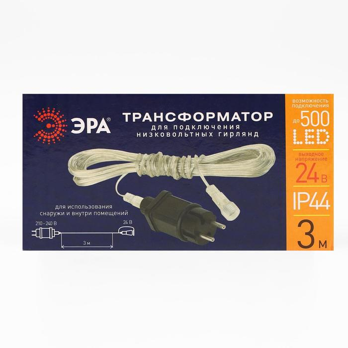 Трансформатор ЭРА (арт. Б0041911) для подключения низковольтных гирлянд подходит для использования как снаружи, так и внутри помещений. Он защищён от влаги и пыли по международному индексу IP44. С его помощью к стандартной электросети подключается даже большая новогодняя гирлянда с 500 светодиодными лампами. Преобразует входное напряжение 210-240 В в выходное 24 В. Изготовлен из меди и поливинилхлорида, не поддерживающего горение. Помимо своей основной функции, имеет и дополнительную - наращивает длину гирлянды на 3 метра. Это даёт возможность использовать праздничную иллюминацию на значительном расстоянии от сети.