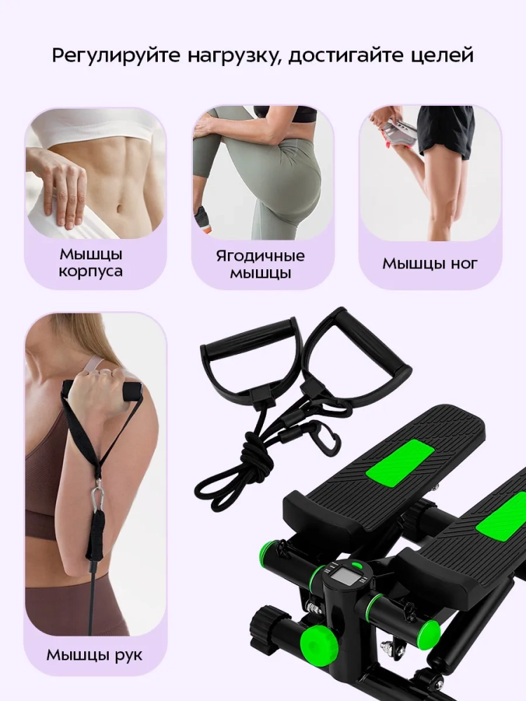 Заниматься на степпере очень просто: для тренировки на тренажере от вас не требуется особых навыков и специальной подготовки. Несмотря на простоту использования, регулярные тренировки дают видимый результат. Кардионагрузка повышает выносливость организма, улучшает координацию движений и работу вестибулярного аппарата, также при правильном питании способствует уменьшению объемов тела. Регулярные занятия на тренажере улучшают работу сердца, сердечно-сосудистой и дыхательной систем. За счет физической нагрузки прорабатываются связки стоп, голеней и коленей, мышцы бедер и ягодиц, межреберные и подвздошно-поясничные мышцы, брюшной пресс и мышцы кора в целом. Наличие эспандеров в комплекте позволяет проработать мышцы рук.