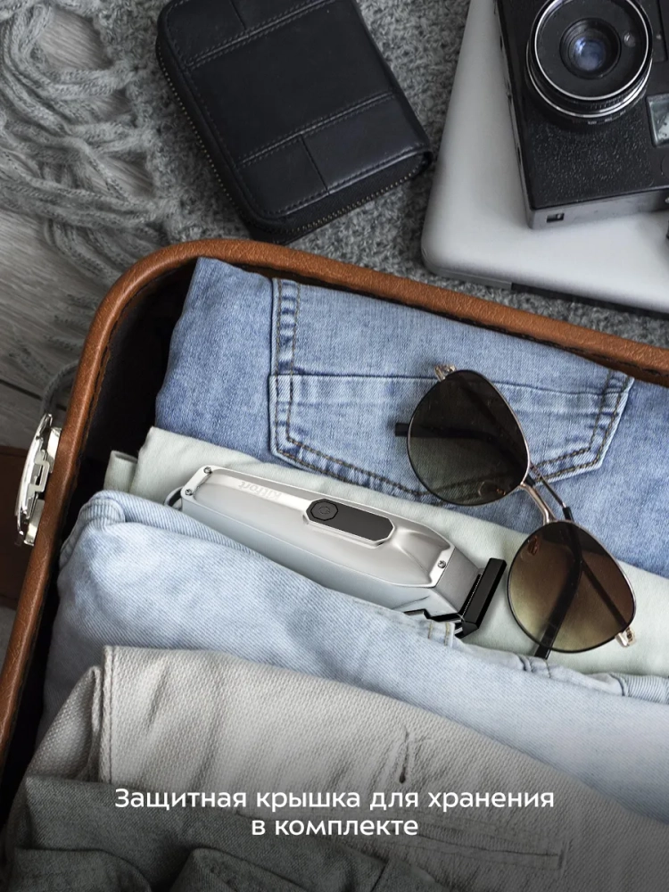 Корпус триммера компактен, что в сочетании с длительным временем работы от аккумулятора позволяет брать его с собой в командировки, походы и путешествия. В комплекте есть защитная крышка для безопасного хранения или перевозки прибора. Функция блокировки защитит от случайного включения прибора. Устройство оснащено специальной петлей для хранения в вертикальном положении.