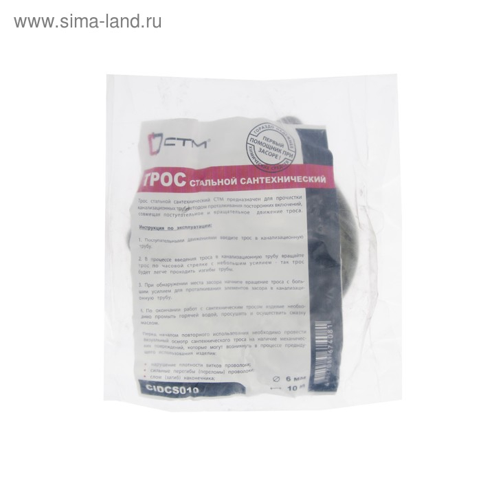 Трос сантехнический "СТМ", с вращающейся ручкой Дн 6 мм, L= 10 м