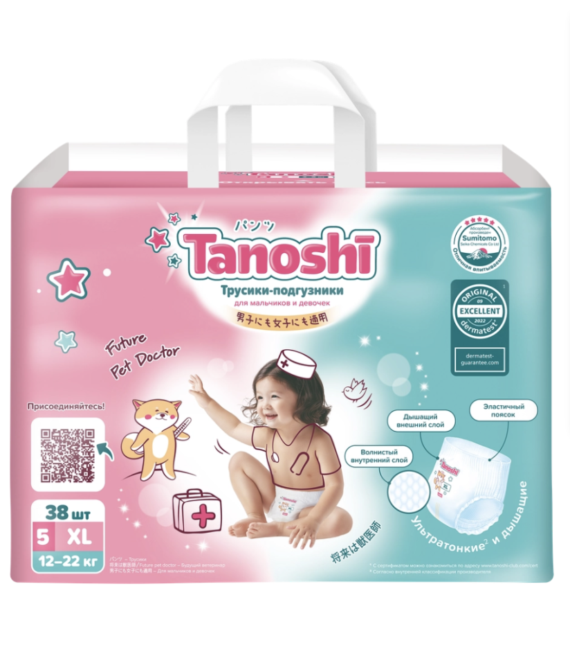 Трусики-подгузники детские TANOSHI XL 12–22кг, 38шт