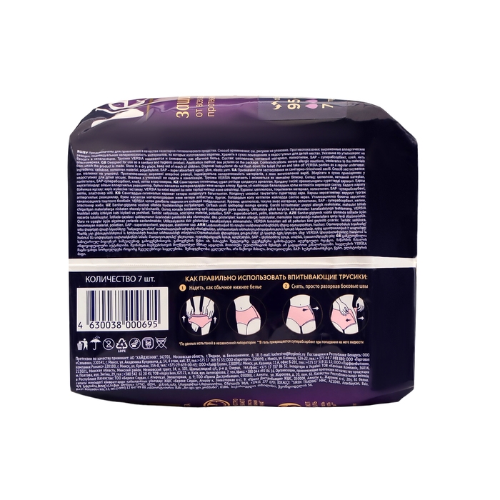 Состав: Целлюлоза, нетканый материал, полиэтилен, SAP - суперабсорбент, клей, нить эластомерная.