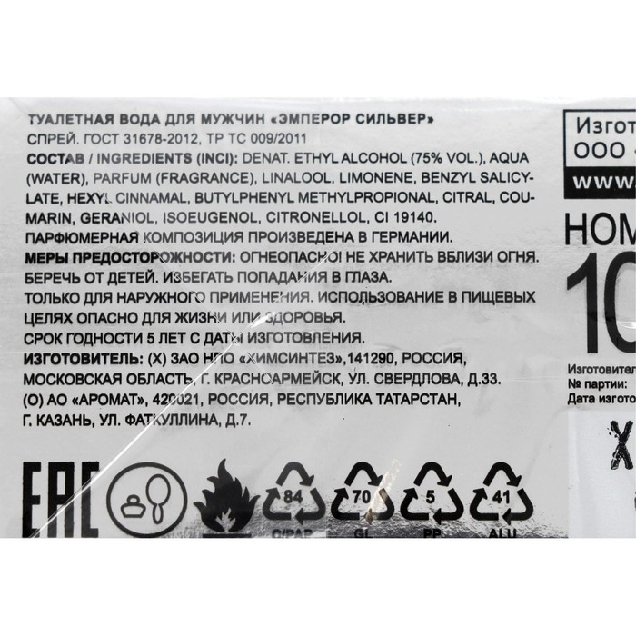 Туалетная вода мужская Emperor Siver, 100 мл (по мотивам Egoiste Platinum (Chanel)