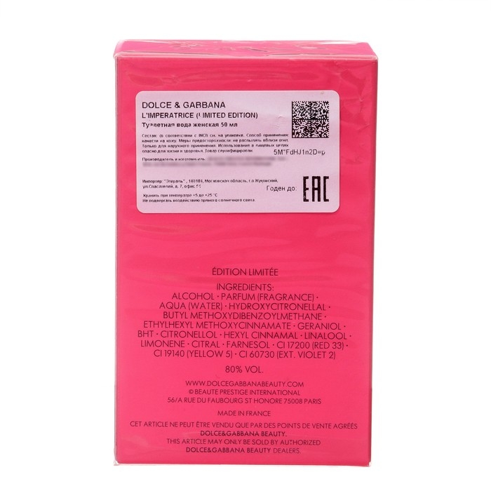Выразительный аромат L'Imperatrice Limited Edition от DOLCE & GABBANA – это вдохновляющая муза. Он акцентирует внимание окружающих на сильной личности решительной женщины, которая уверена в себе.Чистые линии прозрачного флакона окрашены в насыщенный розовый цвет, напоминающий румянец. Его простота и очарование подчеркивают изящную элегантность содержимого. Упаковка украшена логотипом бренда – символом современности и стиля.
