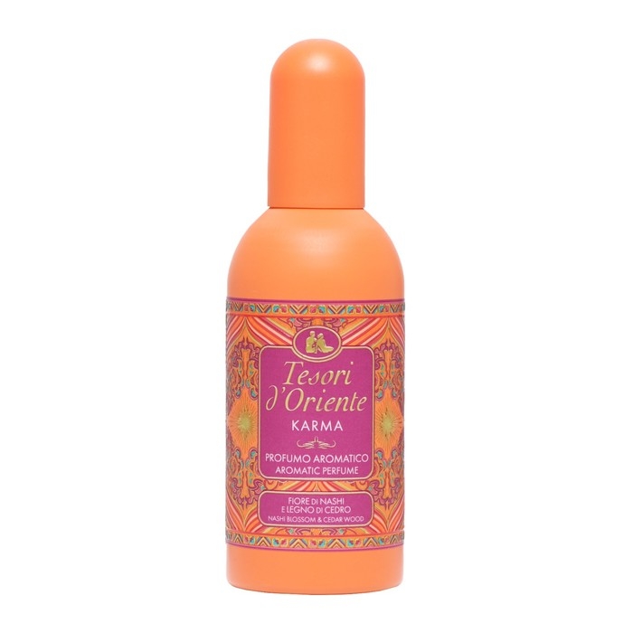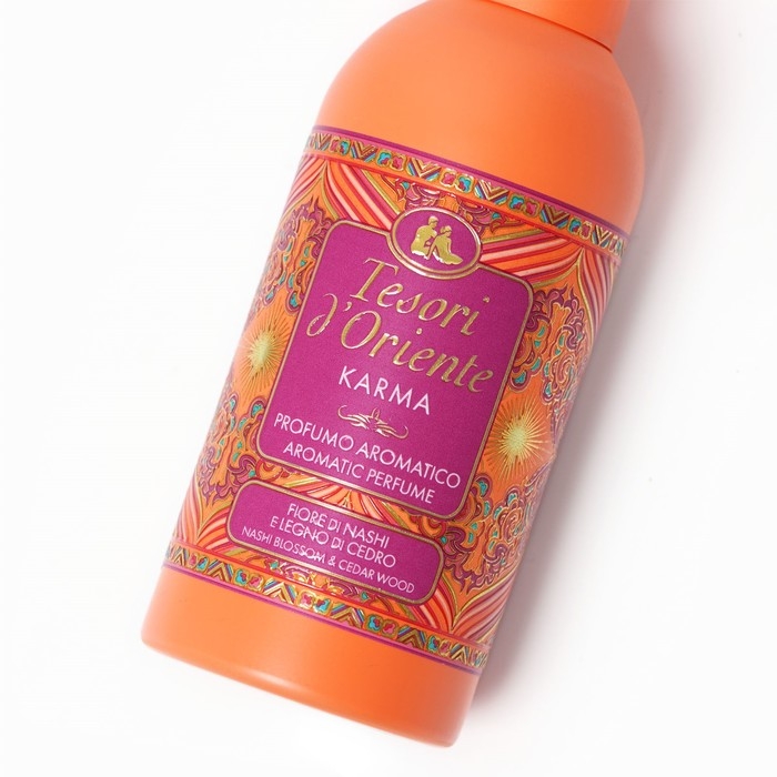Tesori d'Oriente Karma — аромат, дарящий позитив и хорошее настроение. Этот аромат с бодрящим аккордом лимона и бергамота, жизнерадостными цветочными нотами цветка наши и успокаивающими нотами кедрового дерева.