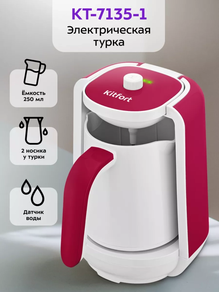 Электрическая турка Kitfort КТ-7135 варит кофе по-турецки. С ней вы сможете быстро и легко сварить натуральный кофе на 4 чашки по 60 мл.
