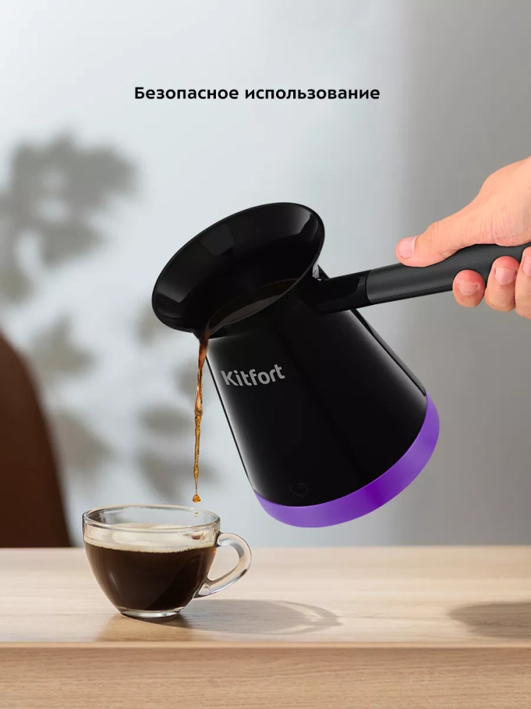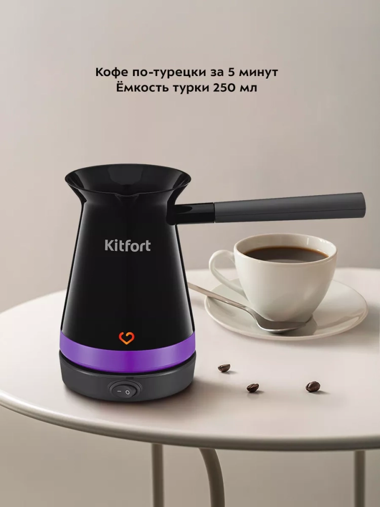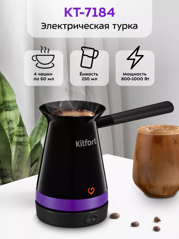 Электрическая турка Kitfort КТ-7184 варит кофе по-турецки. С ней вы сможете быстро и легко сварить натуральный кофе на 5 чашек по 50 мл. Устройство состоит из базы и турки.