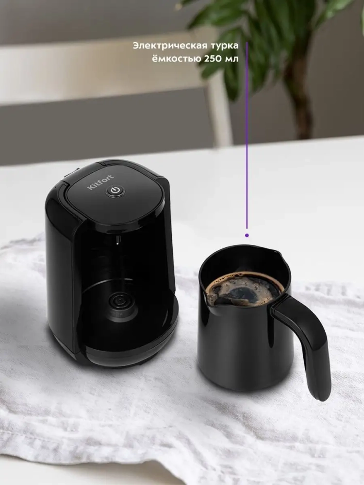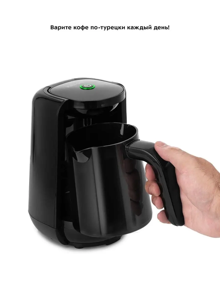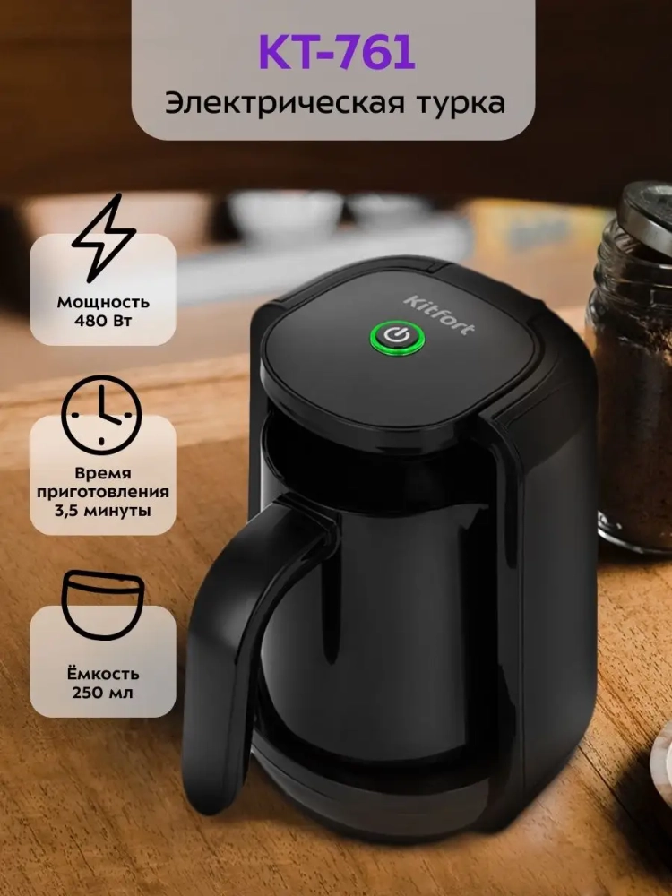 Электрическая турка Kitfort КТ-761 варит кофе по-турецки. С ней вы сможете быстро и легко сварить натуральный кофе на 4 чашки по 60 мл. Кофе по-восточному или кофе по-турецки - кофе приготовленное с помощью варки мелко помолотых зерен кофе в воде. При приготовлении кофе в турке воду с натуральным кофе мелкого помола доводят до кипения, и сразу после закипания турка снимается с огня. Важно не перекипятить кофе и следить, чтобы кофе не убежало. В электрической турке КТ-761 процесс варки кофе автоматизирован. Турка отключается через 3,5 минуты сразу после закипания кофе. В случае если кофе закипит раньше, то пенка, которая образуется при закипании кофе, коснется датчика воды и кофеварка отключится.