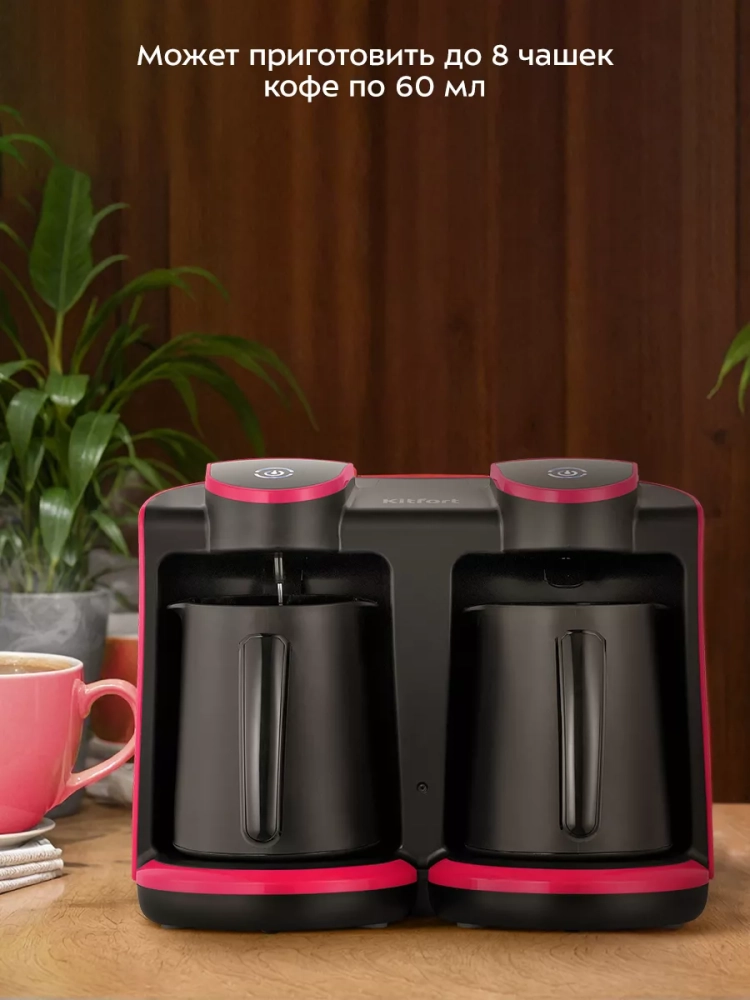 Электрическая турка Kitfort КТ-7492 варит кофе по-турецки. С ней вы сможете быстро и легко сварить натуральный кофе на 8 чашек по 60 мл. Устройство состоит из одной базы и двух турок. У базы 2 контактных группы, каждая турка может работать независимо от второй. Вы можете приготовить сразу большой объем кофе или готовить кофе в каждой турке по-разному — экспериментировать с помолом, количеством молотого кофе и воды и добавлением сахара до или после приготовления.
