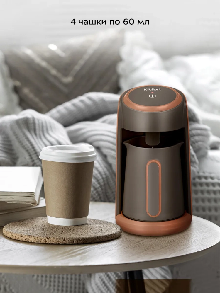 Электрическая турка Kitfort КТ-7456 варит кофе по-турецки. С ней вы сможете быстро и легко сварить натуральный кофе на 4 чашки по 60 мл.