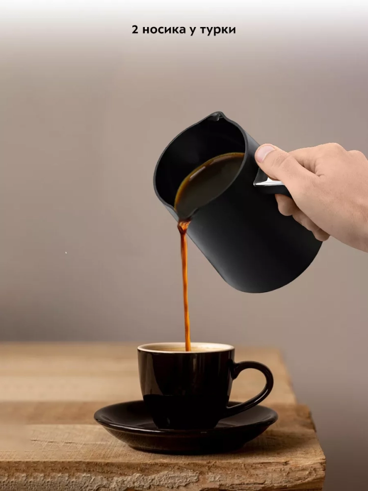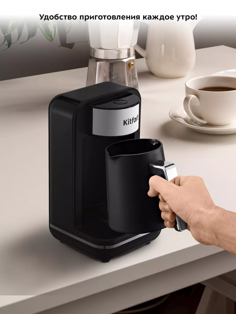 Электрическая турка Kitfort КТ-7491 варит кофе по-турецки. С ней вы сможете быстро и легко сварить натуральный кофе на 4 чашки по 60 мл. Кофе по-восточному или кофе по-турецки — кофе, приготовленный путем варки мелкомолотых зерен кофе в воде. Чтобы сварить кофе по-турецки, в турку засыпают молотый кофе, заливают воду и доводят ее до кипения. При этом образуется пенка. Если своевременно не прекратить нагрев, пенка перельется через край, кофе «убежит». В электрической турке КТ-7491 процесс варки кофе автоматизирован. Турка отключается прежде, чем кофе успеет закипеть. Чтобы пенка не перелилась через край, у электрической турки есть датчик температуры. Как только горячая пенка или вода коснется датчика, электрическая турка отключится. Датчик также нагревается паром, поэтому при малом объеме воды, пенка не коснется датчика, но пар нагреет его, и турка отключится. Кофе по-турецки подается горячим в небольших чашках (около 60 мл). Согласно традиции кофе пьют не сразу, как только его налили в чашку, а через некоторое время, когда кофейная гуща осядет на дно. Ручка турки пластиковая, она не нагревается и удобно лежит в руке. У турки 2 носика, это сделано специально, чтобы вам было удобно наливать кофе в чашку вне зависимости от того, правша вы или левша. Мерная ложка, поставляемая в комплекте, поможет отмерить и засыпать молотый кофе в турку. Электрическая турка состоит из базы и турки. Турка устанавливается на базу наподобие электрического чайника. Турка автоматически отключается благодаря датчику температуры: когда вода закипает, пар нагревает датчик, турка отключается. Если горячая вода или пенка коснутся датчика, турка также отключится. Турка рассчитана на 1–4 порции кофе. Мерная ложка поможет отмерить и засыпать нужное количество молотого кофе. Напряжение: ~220–240 В, 50/60 Гц. Класс защиты от поражения электрическим током: I. Длина шнура: 0,9 м. Размер устройства: 140 х 174 х 245 мм.