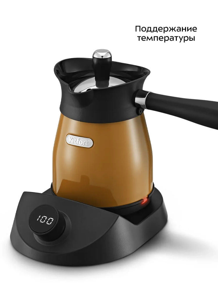 Электрическая турка Kitfort КТ-7498 варит кофе по-турецки. С ней вы сможете быстро и легко сварить натуральный кофе на 5 чашек по 60 мл. Устройство состоит из базы и турки.