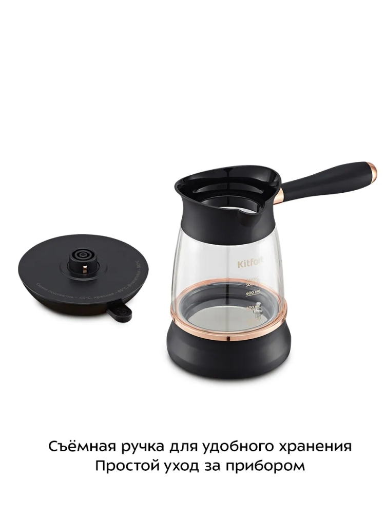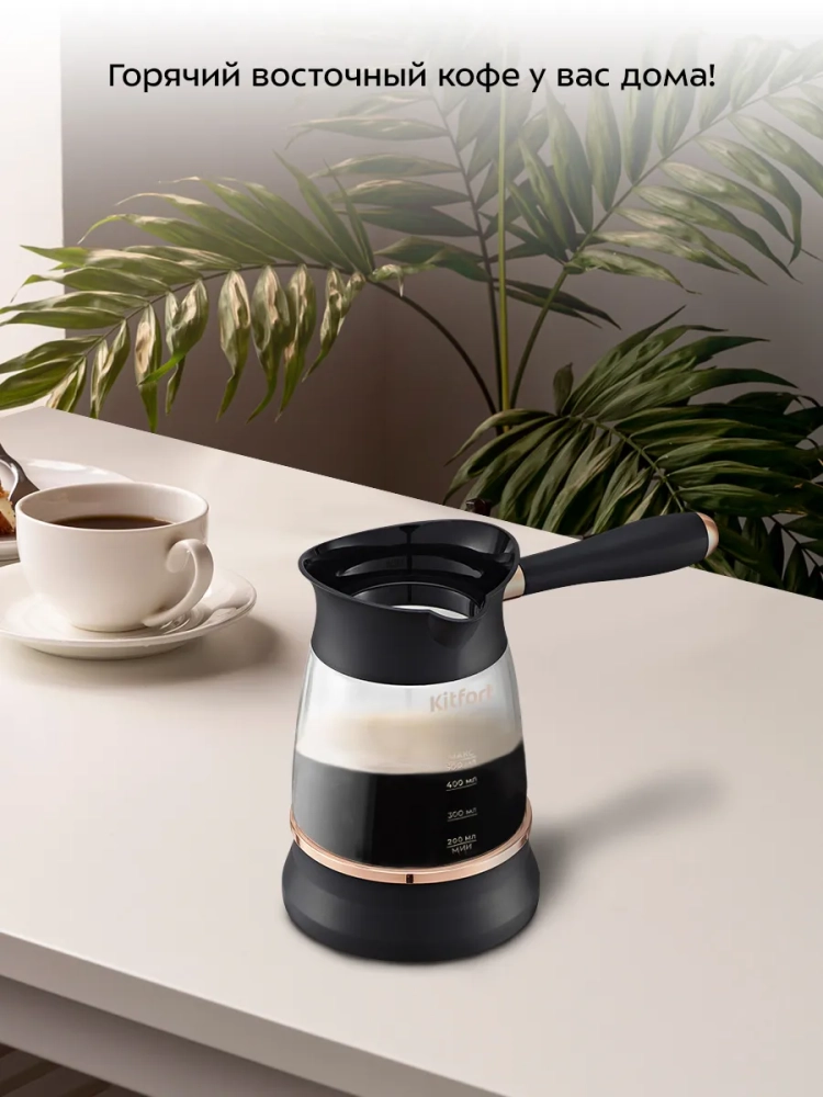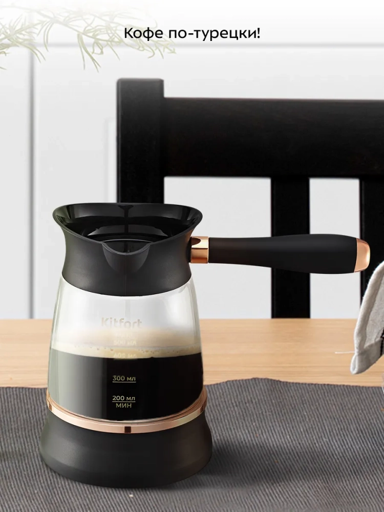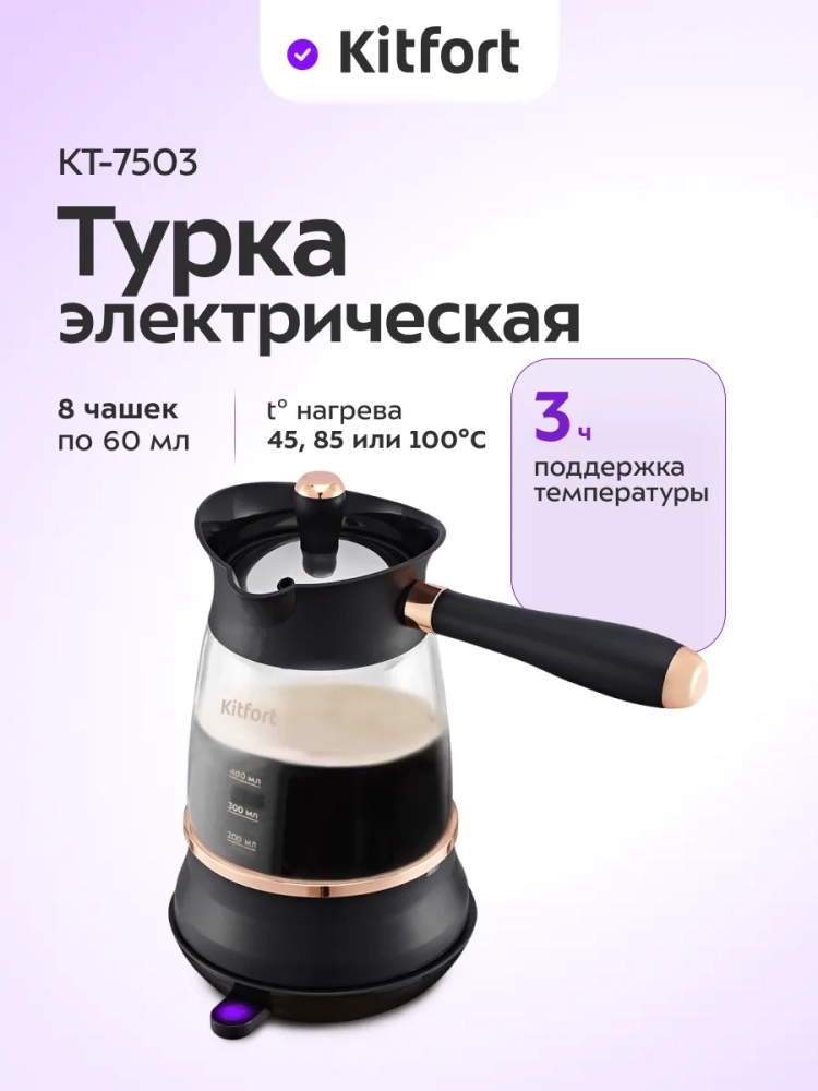 Электрическая турка Kitfort КТ-7503 варит кофе по-турецки. С ней вы сможете быстро и легко сварить натуральный кофе на 8 чашек по 60 мл. Устройство состоит из базы и турки.