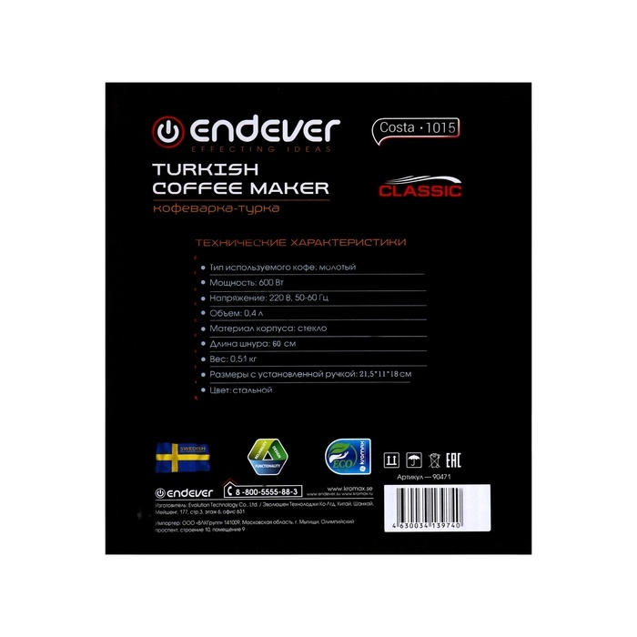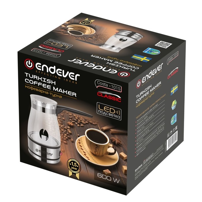 Турка электрическая Endever Costa-1015, 600 Вт, 0.4 л, серебристая
