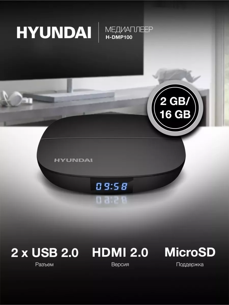 Медиаплеер Hyundai H-DMP100 объединяет в себе телевизионную приставку и устройство с выходом в интернет. Девайс является проводником к фильмам, сериалам, музыке, онлайн-трансляциям. Позволяет просматривать видеоконтент в качестве Full HD и 4K Ultra HD.- Работу устройства поддерживает процессор Hisilicon 3798M Cortex A-53, оперативная память 2Гб и ОС Android 10.- Для хранения скачиваемых приложений и файлов предусмотрена встроенная память объёмом 8 Гб.- Доступ в интернет обеспечивается прямым подключением LAN или через Wi-Fi. На приставке предустановлены сервисы видеоконтента YouTube, IVI, Netflix, Amediateka.