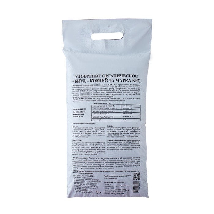 Удобрение органическое БИУД-компост марки КРС гранулированный (на основе навоза крупного рогатого скота) –это высушенный и гранулированный продукт, обладающий эффективным и длительным удобрительным действием. Сбалансированный питательный состав по макро- и микроэлементам усваивается растениями, при обильном начальном поливе, в кратчайшие сроки, повышая урожайность культур до 40%. Удобство в транспортировке, погрузках, хранении и применении (внесении) является для этого препарата отличительной особенностью, приравнивая его по действию на растение к минеральным удобрениям, оставаясь при этом экологически безопасным. Участвует в формировании основы почв, повышая гумусовый состав.Область применения препарата – используется в качестве многоцелевого органического удобрения для полноценного питания всех овощных, садовых и декоративных культур. Имеет эффект структурирования почв, улучшения их воздухо-влагоемкости. Предназначено для инъективных (непосредственно в посадочную лунку или в приствольный круг) подкормок при выращивании ягодников, плодовых кустарников и деревьев, декоративных и цветущих многолетних растений, саженцев, горшечных, выносных и комнатных культур. Особенно эффективен на истощенных и закисленных почвах. Корневые подкормки осуществляются водными настоями препарата.Состав препарата: Удобрение органическое БИУД-компост марки КРС (на основе навоза крупного рогатого скота) термически высушенный, гранулированный.Массовая доля питательных веществ – содержит, не менее %:азота общего – 2,5-3,5;фосфора общего – 2-3;калия общего – 1,5-2,5;кальция общего – 5;магния – 0,2-0,4;микроэлементы – медь, цинк, марганец, кобальт, железо, кремний, бор. Массовая доля воды – 12; реакция среды рН сол. – 6,5-7,5.Особенности и рекомендация по применению препарата:Внимание - использование препарата «БИУД-Компост» марки КРС гранулированного производится под все зеленые культуры, обязательно совмещая на начальном этапе с обильным поливом.Сухая подкормка.Рассадный грунт – размоченный препарат (кашица) смешивают с природными компонентами почвы или торфогрунта в пропорции 10 % от общего объема.В лунки овощным культурам –30-40 гр., в рядки для зелени, моркови и свеклы - 50-70 гр. на погонный метр – 2-3 раза за сезон.Ягодные – 30-40 гр/растение – не менее чем два раза за сезон.Плодовые деревья и кустарники – 50-60 гр/кв. м приствольного круга, частота внесения желательно не менее 3 раз в период вегетации.Подкормка жидкая.Приготовление настоя – 2л. препарата, дать настояться в 20 л теплой воды, выдерживая не менее суток, далее активно помешивая, растворить. Полученный концентрат разбавить водой до рабочего раствора в соотношении 1/10. Производить полив под корень.Овощные культуры – 3-4 раза за сезон под корень по 1 литру, зеленые культуры 3-4 раза за сезон по – 3 литра на погонный метр.Ягодные – 2-3 раза за сезон под растение 300-400 мл.Плодовые и ягодные деревья и кустарники 3-4 раза в сезон по 3 -10 л. на растение.Подкормки производить совмещая с поливом.