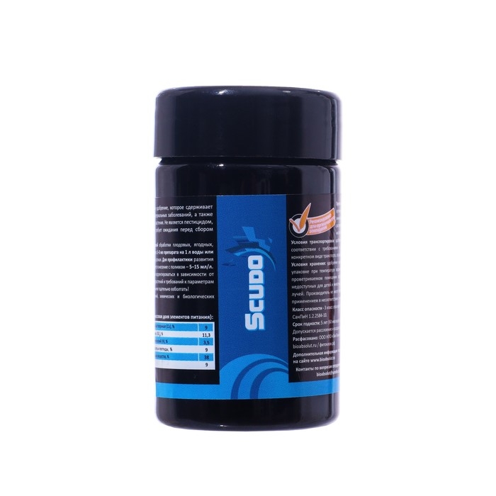 СКУДО / SCUDO - защита и лечение от всходов до урожая.Органо-минеральное лечебное удобрение для листовых обработок, которое за счет сульфата меди сдерживает развитие возбудителей заболеваний, а также запускает иммунные и восстановительные механизмы растения благодаря высокому содержанию растительных аминокислот и органических веществ.СКУДО - уникальный контактно-системный продукт, сочетающий комплекс факторов питания и лечения, равно необходимых растениям на всех этапах развития.ОСОБЕННОСТИ ПРЕПАРАТАОказывает быстрое и эффективное, системное и контактное действие против возбудителей ряда заболеванийПовышает устойчивость к абиотическим стрессам (жара, заморозки, засуха, низкая освещенность, град и т.д.)Мощный запас органических веществ и аминокислот для обновления и заживления пораженных тканей растенияНе является пестицидом и не требует ожидания перед уборкой и реализацией урожаяРазрешен для органического земледелияРастительные аминокислоты (природный хелатор) в тандеме с сигнальными пептидами обеспечивают максимально эффективное поглощение меди и серы листовым аппаратом: именно эта структура делает СКУДО легко усваиваемым и подвижным внутри растения.Взаимодействие компонентов СКУДО с биохимическим процессом растения ведет к повышению естественной (эндогенной) устойчивости к стрессам и толерантности к грибным и бактериальным заболеваниям.СКУДО благодаря наличию растительных аминокислот и других молекул с высокой биологической ценностью помогает растениям преодолевать стресс, вызванный дисбалансом питания и неблагоприятными условиями окружающей среды (холод, жара, избыток солей).СКУДО – уникальное контактно-системное лечебное удобрение, которое сдерживает развитие возбудителей большинства грибных и бактериальных заболеваний, а также запускает иммунные и восстановительные процессы растения. Не является пестицидом, не токсично в рекомендованных дозировках, не требует ожидания перед сбором урожая, не оставляет следов на листьях и плодах.Рекомендации по применению:в качестве листовой обработки плодовых, ягодных, овощных, декоративных и цветочных растений из расчета 1-3 мл препарата на 1 л воды или 0,1-0,3% р-р, каждые 14-30 дней от рассады до сбора урожая. Для профилактики развития болезнетворных микроорганизмов в субстрате, допускается внесение с поливом – 5-15 мл/л. Дозировки, частота и количество обработок должны корректироваться в зависимости от применяемых агротехнологических методов, состояния растений и требований к параметрам урожая. Перед применением тщательно взболтать!