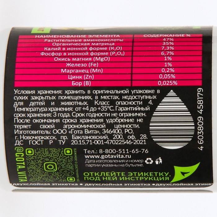 Удобрение суперконцентрат Gota Vita, активное цветение, "Капля жизни", 100 мл
