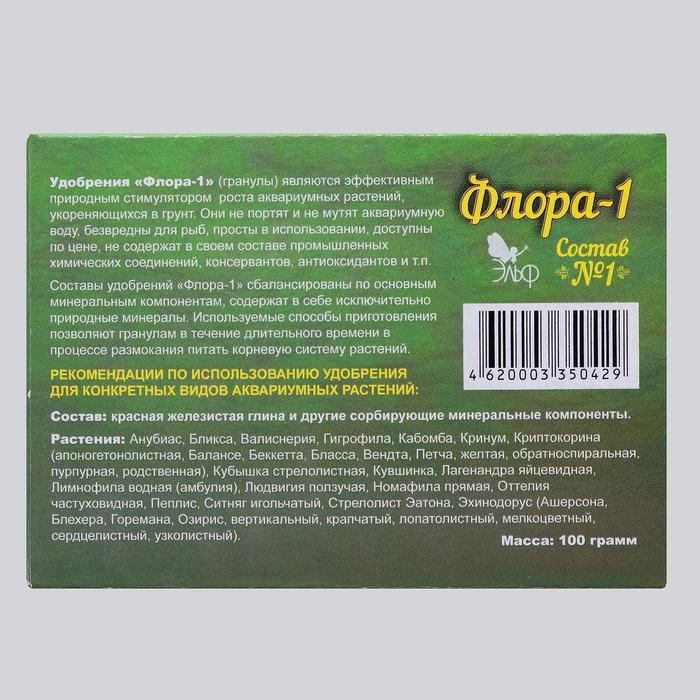 Составы удобрений «Флора-1» сбалансированы по основным минеральным компонентам и содержат в себе исключительно природные материалы, доставленные из экологически чистых районов. Все составляющие удобрений «Флора-1» обладают хорошо выраженными свойствами иного обмена и сорбции. Именно они обеспечивают благоприятный для аквариумных растений режим обмена органикой, микроэлементами, биогенными компонентами, одновременно поглощая вредные вещества (например, соли цветных металлов) если их концентрация в воде велика.