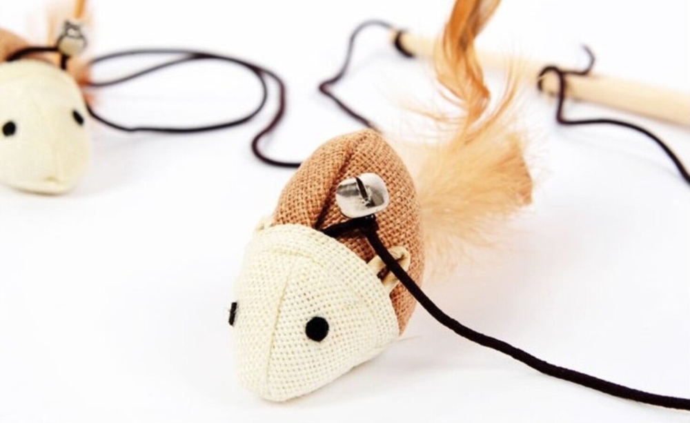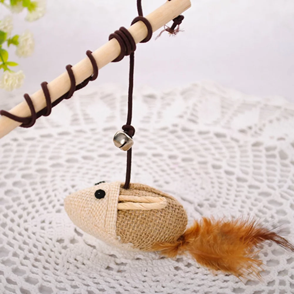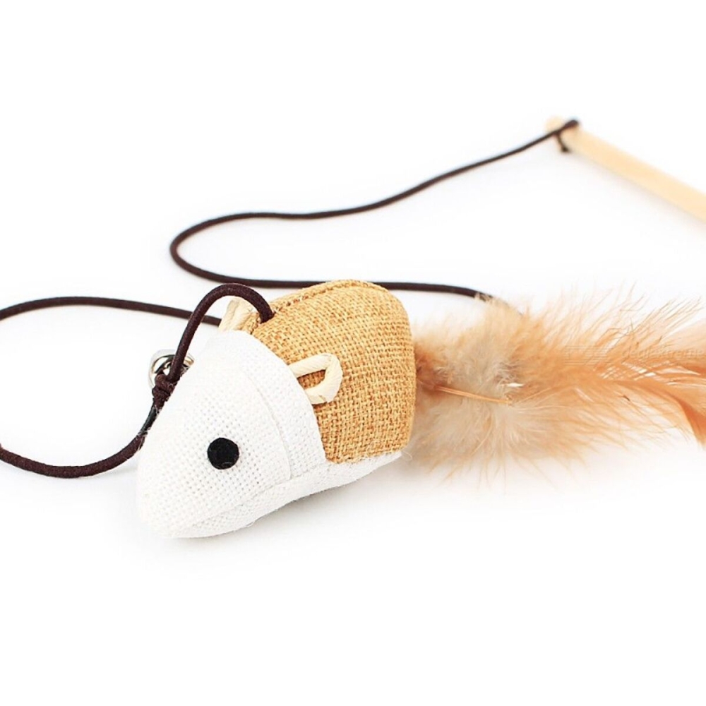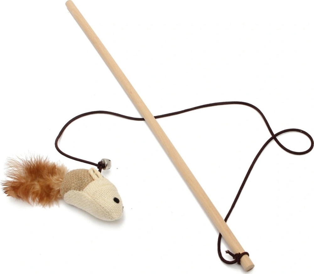 Удочка дразнилка (деревянная) с мышкой и колокольчиком для кошек из натуральных материалов.