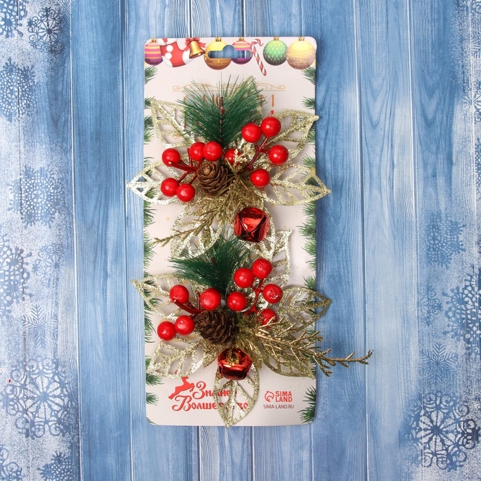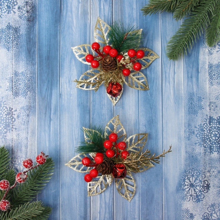 Украшение ёлочное "Праздничные цветы" (набор 2 шт) ягоды, 12 см, золото