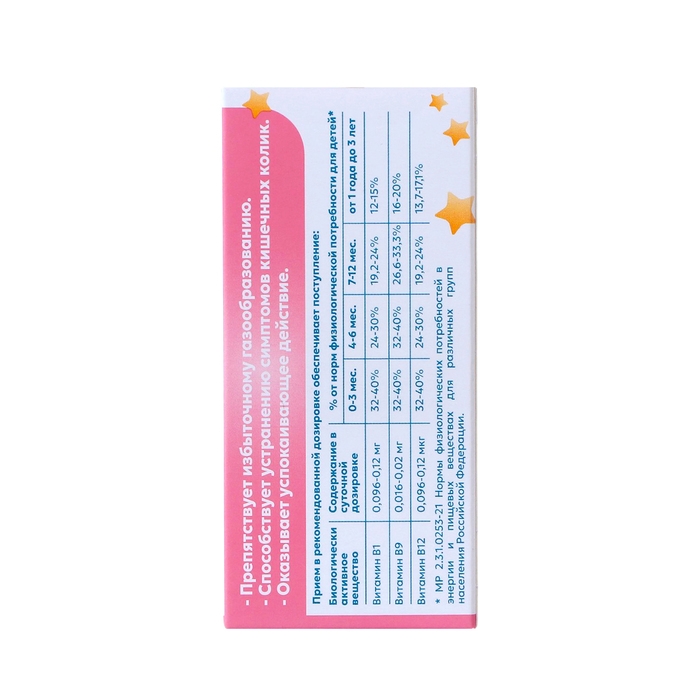 Состав: глицерин (Е422 – носитель), концентрат смеси эфирных масел (эфирное масло плодов аниса обыкновенного, эфирное масло плодов укропа аптечного (фенхеля), эфирное масло листьев мяты перечной).