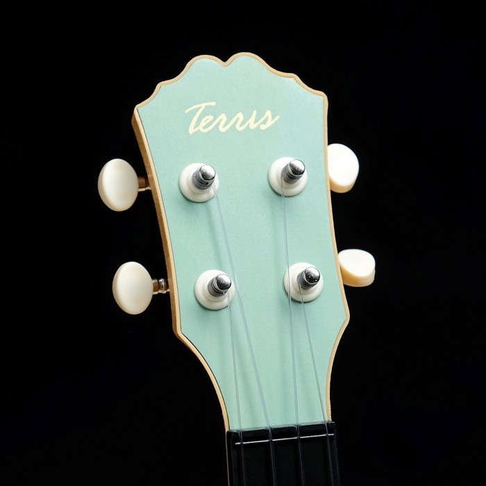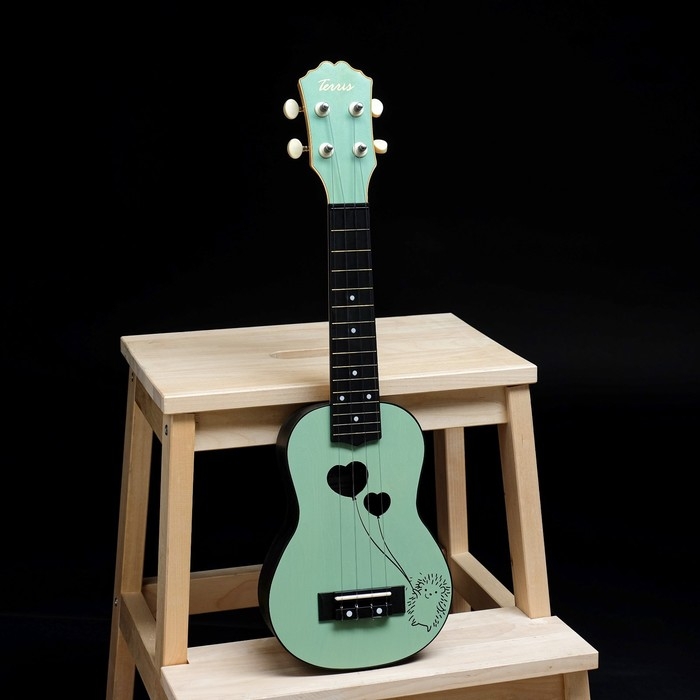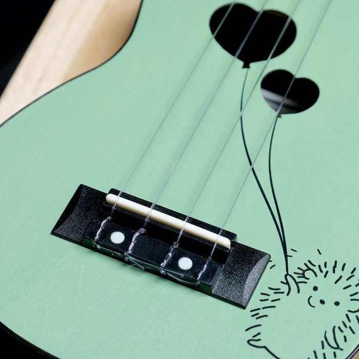TERRIS PLUS HARI - укулеле нежно-зеленого цвета, на верхней деке которой изображен ежик, а резонаторное отверстие выполнено в форме воздушных шариков-сердечек.