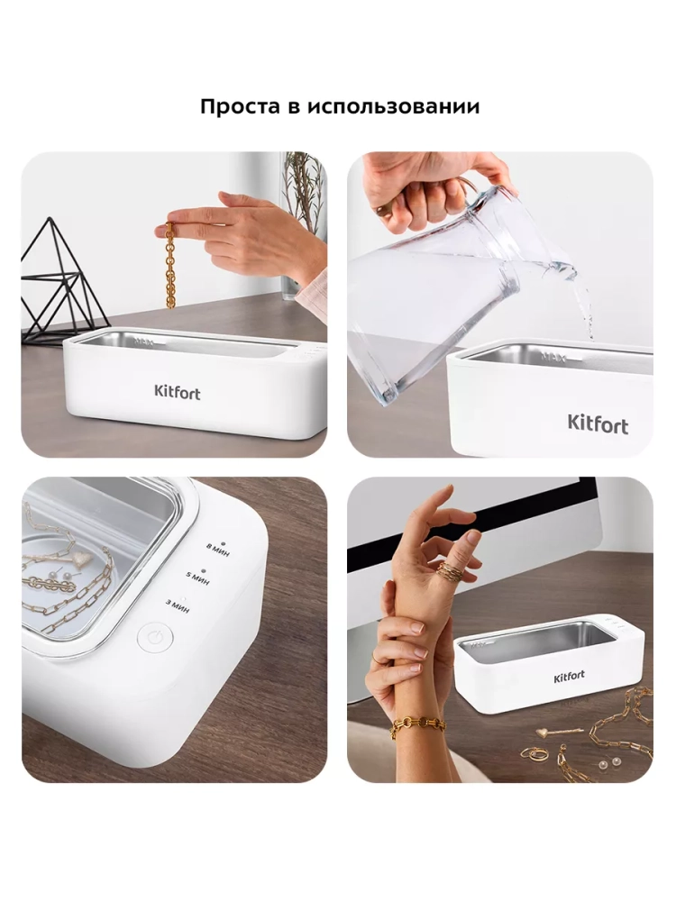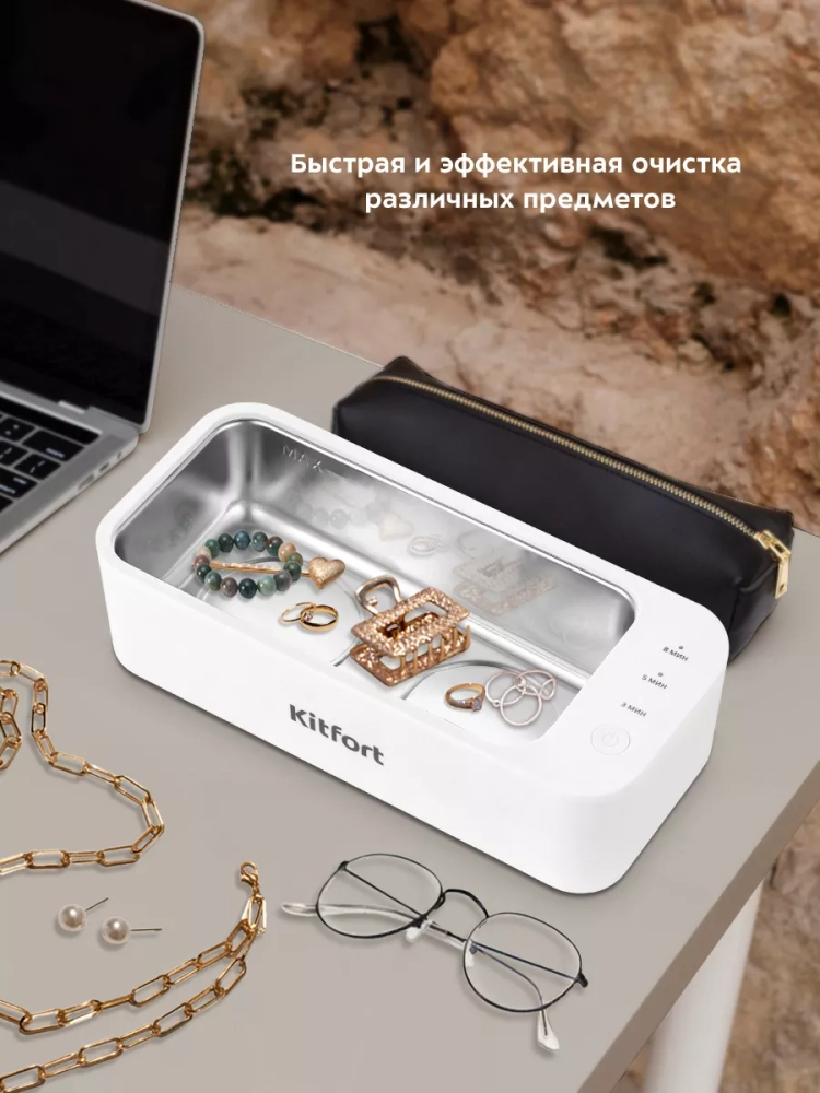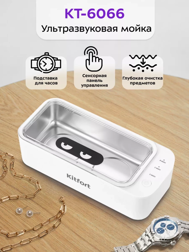 Ультразвуковая мойка Kitfort КТ-6066 поможет эффективно очистить и продезинфицировать небольшие изделия из металла, пластика и стекла. Вам нужно налить воду в мойку и положить в нее изделия, например, золотые украшения, браслет от часов, серьги, зубные протезы, очки и прочее.