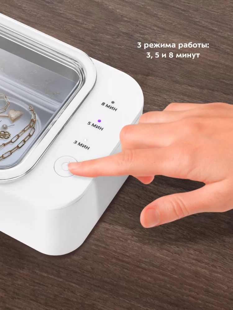 Корпус прибора сделан из пластика, а резервуар, в который помещаются предметы для очистки — из нержавеющей стали. Прозрачная пластиковая крышка позволит наблюдать за процессом очистки.