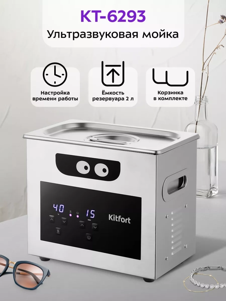 Ультразвуковая мойка Kitfort КТ-6293 поможет эффективно очистить и продезинфицировать небольшие изделия из металла, пластика и стекла. Ультразвуковая очистка — способ очистки поверхности твёрдых тел в жидкости, при котором в жидкость вводятся ультразвуковые колебания. Применение ультразвука значительно ускоряет процесс очистки и повышает качество очистки. В качестве жидкости в ультразвуковой мойке можно использовать воду, а также чистящие или дезинфицирующие растворы. В основе работы ультразвуковой мойки лежит кавитация, когда в жидкости за короткий промежуток времени образуются и тут же разрушаются миллионы мелких пузырьков воздуха. Пузырьки лопаются и, таким образом, высвобождается большое количество энергии. Этот процесс происходит вследствие чередования волн низкого и высокого давления под воздействием ультразвука. Воздушные пузырьки, соприкасаясь с поверхностью обрабатываемых предметов, разрываются, создавая множество маленьких ударных волн. Благодаря этому происходит глубокая очистка предметов. Корпус прибора, крышка и резервуар сделаны из нержавеющей стали. Благодаря большому размеру вы можете очищать более крупные предметы или много небольших предметов за 1 раз. Управление прибором осуществляется при помощи кнопок на панели управления. Вы можете выбрать время работы 5–30 минут с шагом 5 минут, после которого мойка автоматически отключается, и температуру нагрева воды 20–80 °C с шагом 5 °C. Во время работы на дисплеях отображаются температура и оставшееся время работы. Можно включить только нагрев, только УЗ-чистку или и нагрев, и чистку одновременно. Главное преимущество ультразвуковых моек — это возможность очищать предметы сложных форм. Еще одним достоинством является быстрота процесса при его высокой эффективности. Длина шнура: 1,2 м. Максимальная температура воды: 49 *С. Размер резервуара: 238 х 162 x 101 мм.