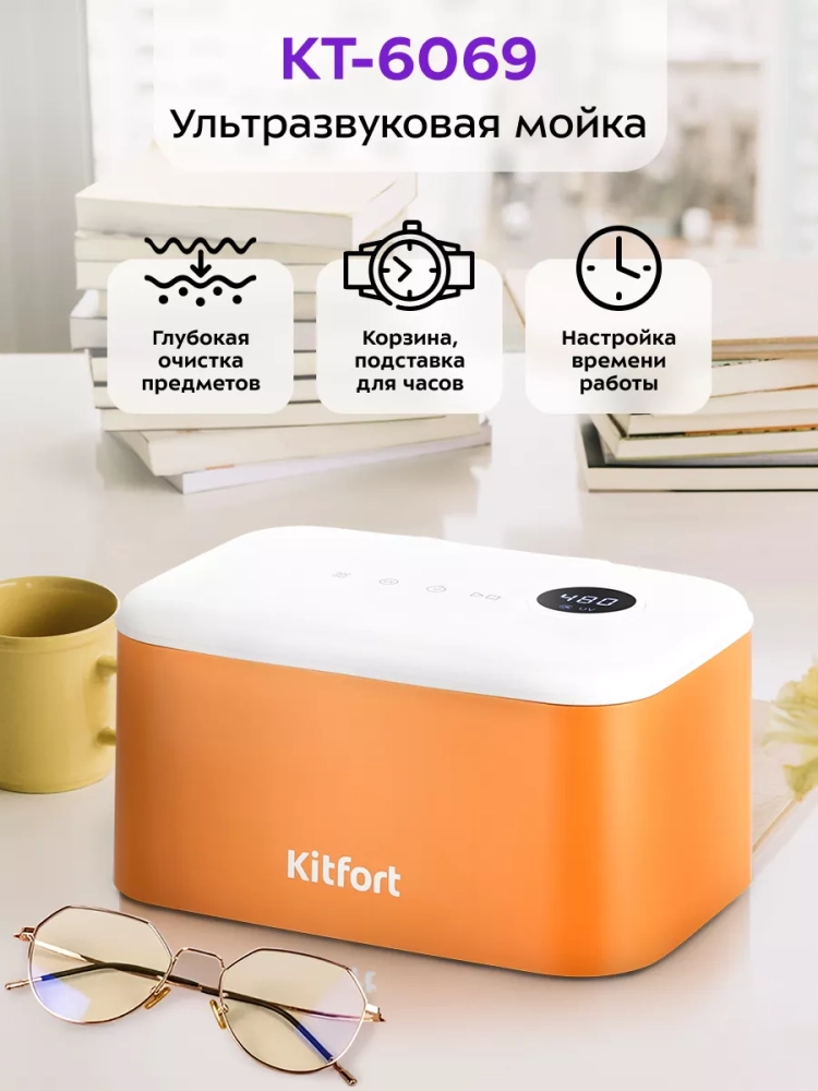 Ультразвуковая мойка Kitfort КТ-6069 поможет эффективно очистить и продезинфицировать небольшие изделия из металла, пластика и стекла. Ультразвуковая очистка — способ очистки поверхности твёрдых тел в жидкости, при котором в жидкость вводятся ультразвуковые колебания. Применение ультразвука значительно ускоряет процесс очистки и повышает ее качество. В качестве жидкости в ультразвуковой мойке можно использовать воду, а также чистящие или дезинфицирующие растворы.