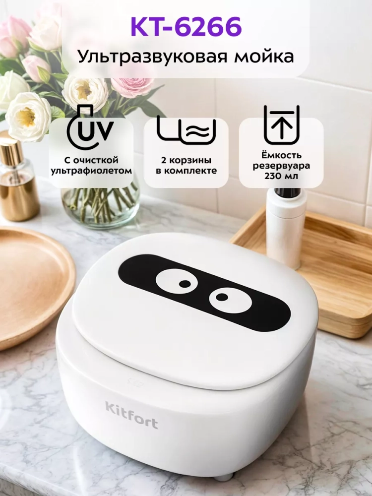 Ультразвуковая мойка Kitfort КТ-6266 поможет эффективно очистить и продезинфицировать небольшие изделия из металла, пластика и стекла. Ультразвуковая очистка — способ очистки поверхности твёрдых тел в жидкости, при котором в жидкость вводятся ультразвуковые колебания. Применение ультразвука обычно значительно ускоряет процесс очистки и повышает его качество. В качестве жидкости в ультразвуковой мойке можно использовать воду, а также чистящие или дезинфицирующие растворы.
