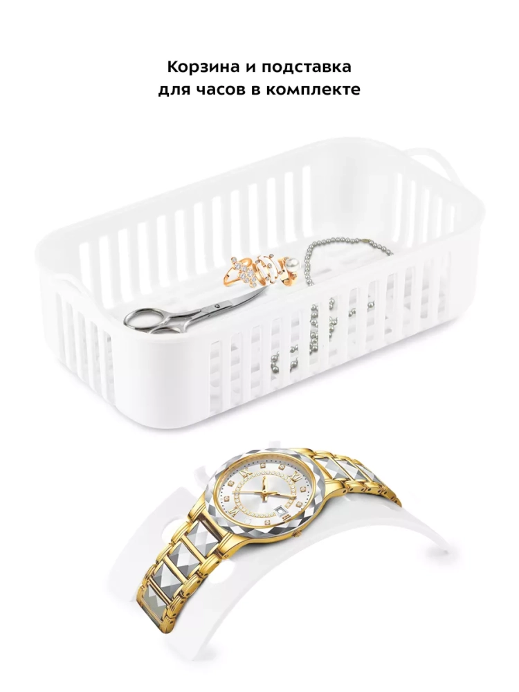 Корпус прибора сделан из пластика, а резервуар, в который помещаются предметы для очистки, — из нержавеющей стали. Прозрачная вставка в крышке позволит наблюдать за процессом очистки.