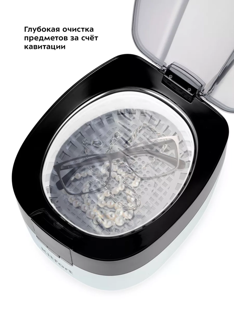 Корпус прибора сделан из пластика, а резервуар, в который помещаются предметы для очистки, — из нержавеющей стали. Прозрачная часть крышки позволит наблюдать за процессом очистки. Во время работы включается синяя подсветка.